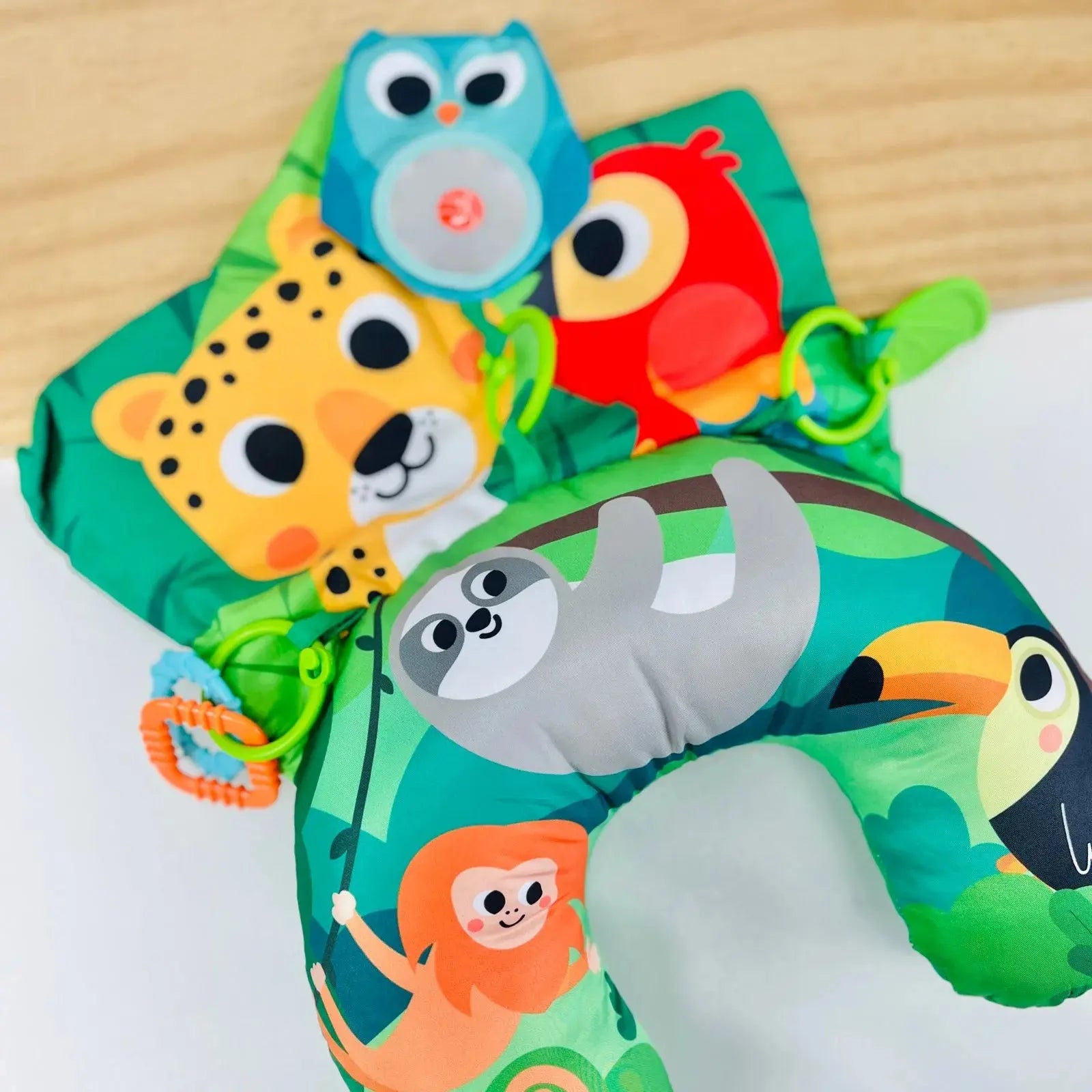 Sugestões de uso: Posicione a almofada durante o tempo de bruços (“tummy time”) ou nos momentos de relaxamento para estimular o bebê a tocar, morder e explorar. Ideal para sessões curtas e acompanhadas por um adulto, promovendo interação afetiva e segurança. Evite lavar em máquinas e mantenha sempre supervisionado o uso.