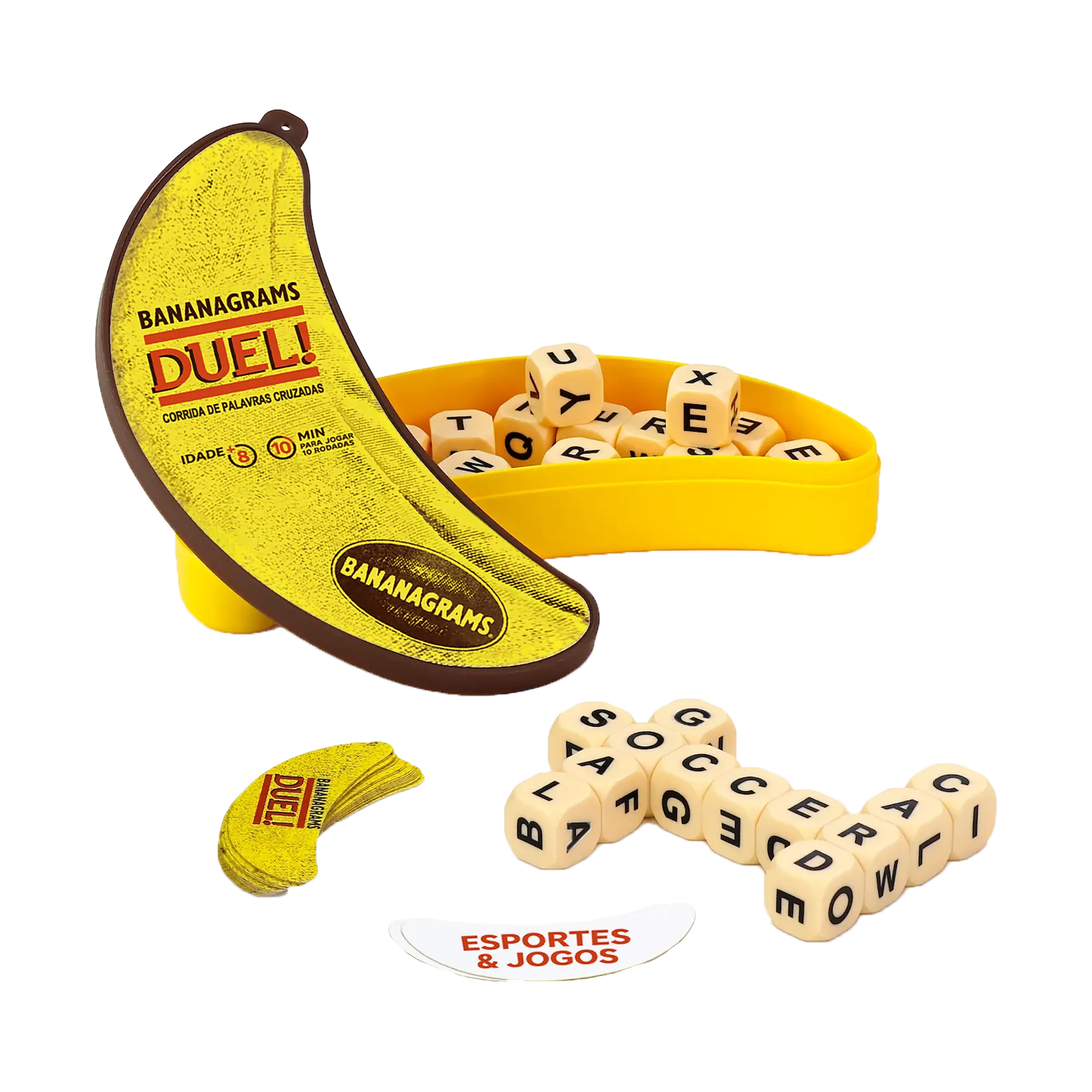 Sugestões de uso: Utilize o Bananagrams Duel como um momento de conexão entre pais e filhos. Proponha desafios temáticos com palavras simples, ajude na pronúncia e incentive o uso de novas palavras durante o jogo. A partir dos 2 anos, é possível usar os dados apenas para nomear letras ou associar sons e palavras, de forma lúdica.