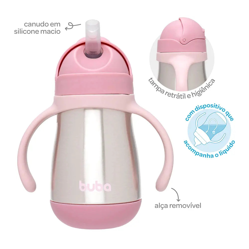 Apresentamos o Copo Térmico Parede Dupla com Alça e Canudo da Buba na cor rosa, desenvolvido para acompanhar os pequenos em todas as fases da introdução alimentar e no desenvolvimento da autonomia. Com design funcional e pensado nos mínimos detalhes, este copo une praticidade, conforto e segurança para o dia a dia das famílias.