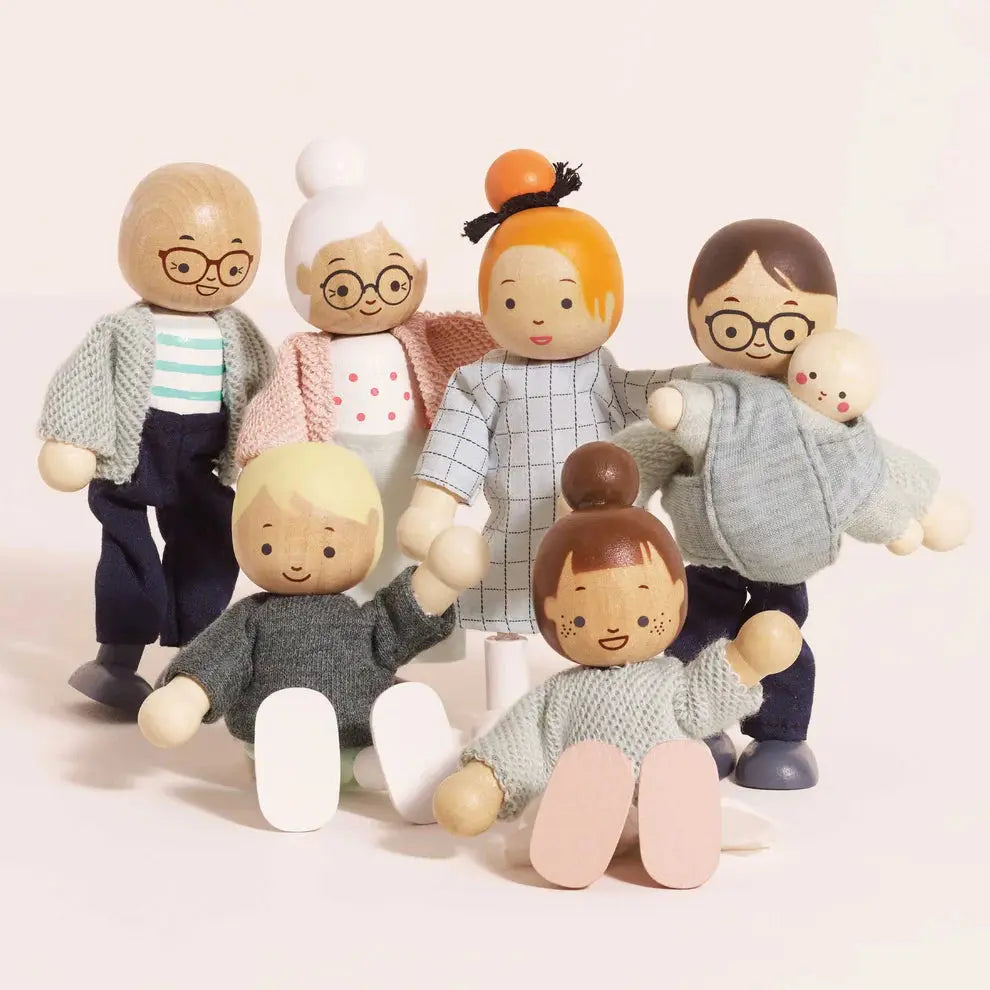 Prepare-se para momentos de pura ternura e imaginação com a Família para Casa de Bonecas. Este conjunto encantador convida as crianças a recriar laços de afeto e cenas do cotidiano com sete bonecos articuláveis que representam pais, avós, filhos e um adorável bebê com seu porta-bebê. Pensada com amor e cuidado, essa família estimula o brincar simbólico, essencial para o desenvolvimento emocional, social e criativo na infância. Feita em madeira sustentável, com roupas costuradas à mão e pintura atóxica, é uma escolha consciente para quem valoriza infância com propósito.