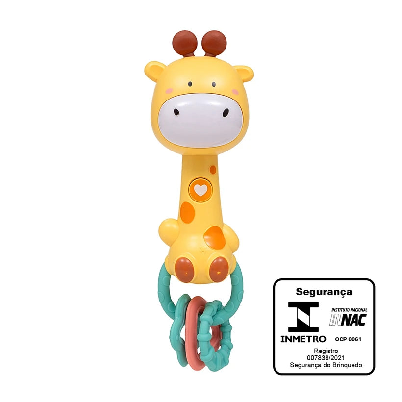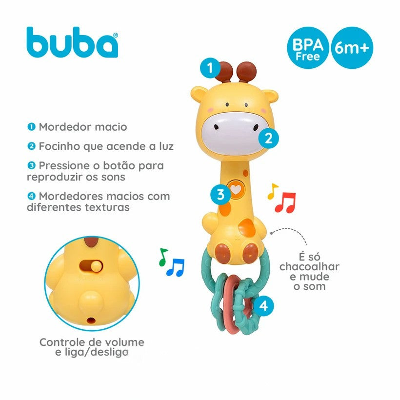 Com a Girafa Musical Buba, cada chacoalhar é uma nova aventura! Segurança, estímulo e diversão se unem em um brinquedo completo que vai acompanhar o crescimento e o desenvolvimento do seu bebê, trazendo tranquilidade para os pais e alegria para os pequenos.