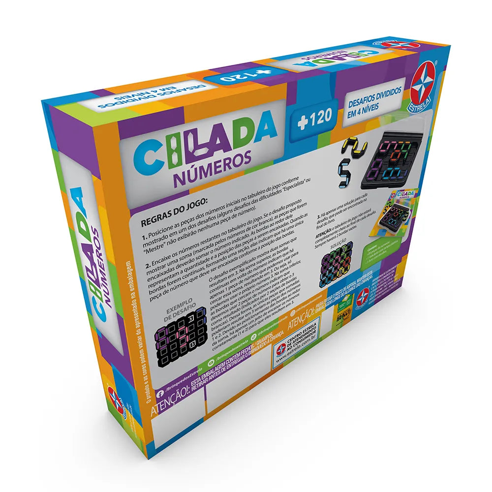 O Cilada Números desafia o jogador a encaixar todas as peças numeradas no tabuleiro conforme os desafios do livro. Com mais de 120 desafios divididos em 4 níveis de dificuldade, ele promove estratégia, raciocínio lógico e muita diversão.