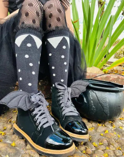Inspirada no charme sombrio e irresistível da Vandinha, essa meia é perfeita para quem ama um visual dark com personalidade. Seja no look da escola, em casa ou para aquele toque especial no visual, ela é conforto com rebeldia, elegância com um quê de travessura. Para crianças estilosas e adultos nada óbvios!