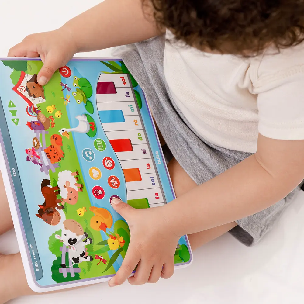 Apresentamos o Tablet Cantando com os Animais - Buba, um brinquedo pensado para encantar os primeiros anos do bebê. Com design seguro, bordas arredondadas, tela sem borda sensível ao toque e luzes coloridas em toda a volta, este tablet anima o momento de brincar com sons reais de animais, músicas infantis cantadas pelos animais, teclas de piano e toques sonoros de dó-ré-mi — tudo para estimular o desenvolvimento sensorial de forma divertida e segura.