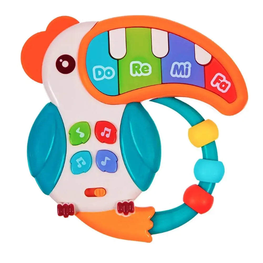 Utilize o Tucano Musical durante momentos de interação com o bebê, como o tempo de bruços ou no tapete de atividades. Estimule-o a tocar as teclas, explorar as argolas e morder a crista. Ideal também para acalmar e distrair em passeios ou durante a dentição.