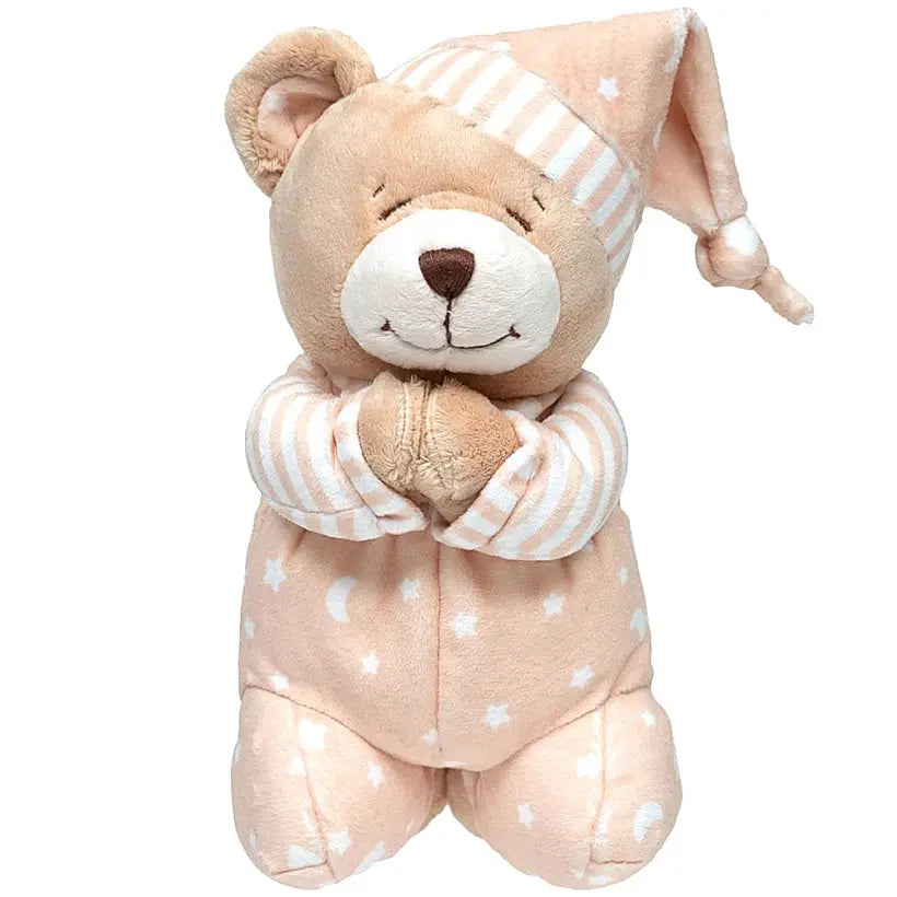 Sugestões de uso: Utilize o ursinho durante o ritual de sono do bebê, apertando a barriguinha para que a oração acalme e traga segurança emocional. Também pode ser inserido em momentos de tranquilização ou transição, como mudanças de ambiente ou separação do cuidador.