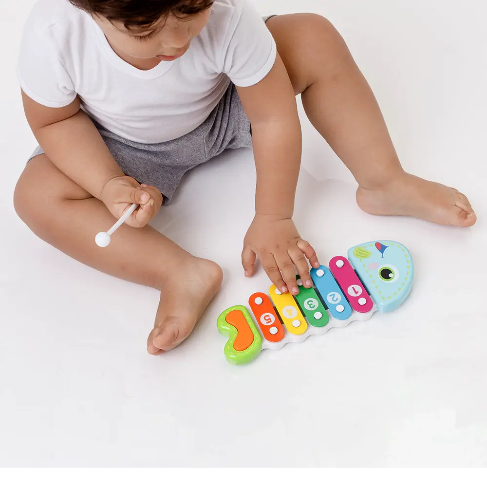 Apresente o xilofone ao bebê em momentos calmos, como após a troca de fralda ou antes do banho. Toque uma tecla por vez, nomeando as cores ou imitando sons de animais para estimular a escuta ativa e a curiosidade. Pode ser usado com ou sem o bastão, conforme a idade e o desenvolvimento da criança.